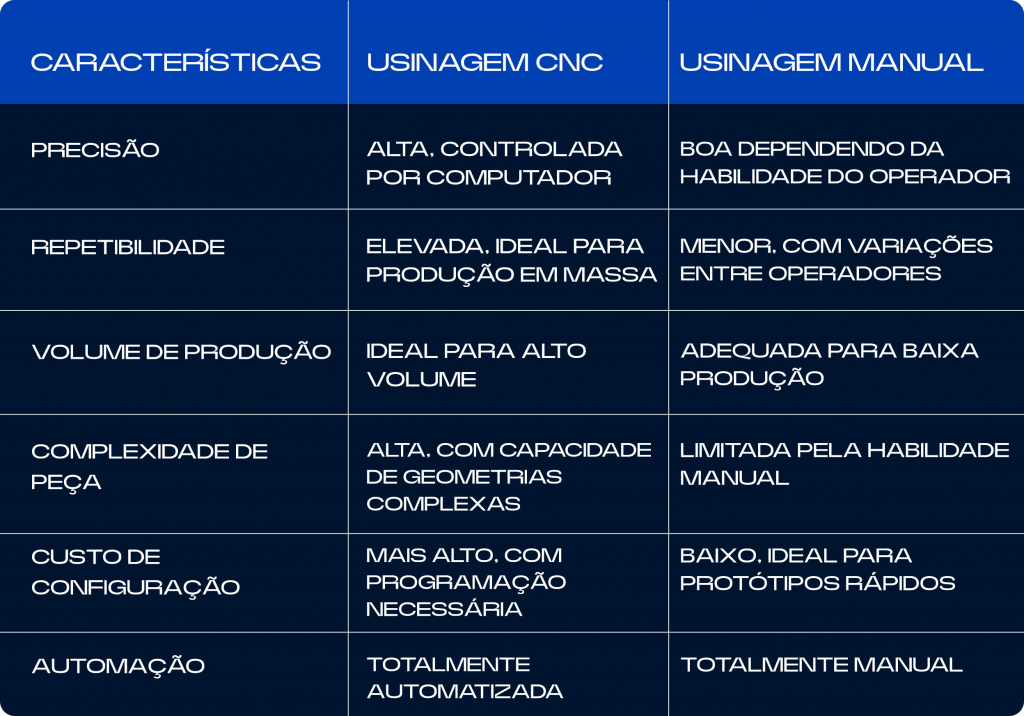 - Baixo custo de configuração: Para produções menores ou protótipos, a usinagem manual pode ser mais econômica, já que não exige o tempo e o custo de programação de máquinas.